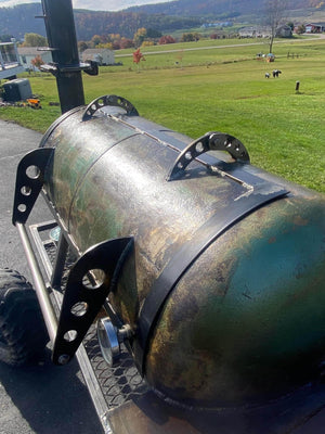 This swivel handle is ready to be welded onto your smoker build! You will receive the steel brackets and stainless steel handle and hardware. Stainless steel pipe is cut to the length of your choice, end caps welded on, drilled and tapped, and stainless steel hardware added to allow swivel.