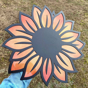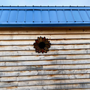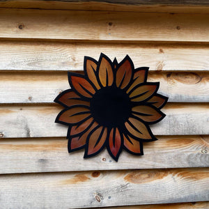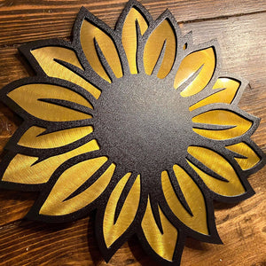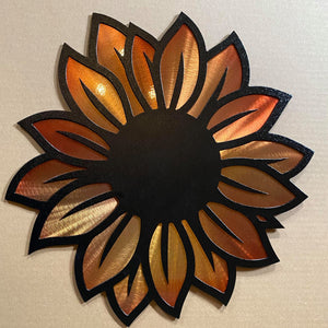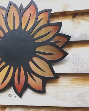 A beautiful layered sunflower, made from a thick metal and has a keyhole hanger cut in the back for easy hanging!