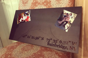 Metal Magnet Board, perfect for pictures, keepsakes, messages, notes and more. Personalized with your custom personalization. Coordinates, quotes, names, and more are popular options. Magnets are NOT included.