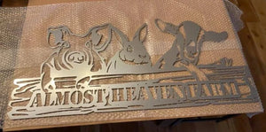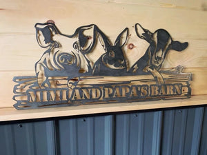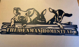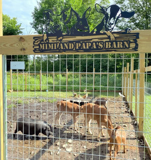 Elevate your farm or barn décor with our farm metal sign, featuring a pig, rabbit, and goat perched atop personalized "barn wood". Whether it's a warm welcome or a proud display of your farm's name, this sign captures the heart of rustic charm.