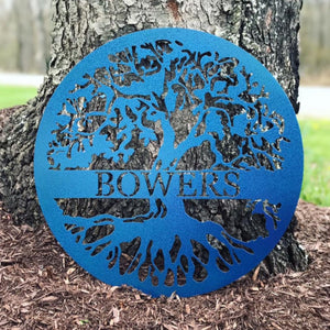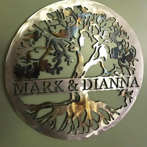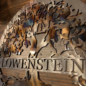 Elevate your space with our personalized Tree of Life Metal Sign, customized with the name of your choice. The temper-colored finish is shown in the sign that says "MATERIA." It undergoes a heating process that brings out the blue, purple and brown hues.