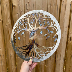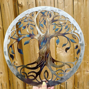 Our Temper Colored finish for our Tree of life is created from heating the steel to achieve the blue, purple and brown hues and then clear coated.